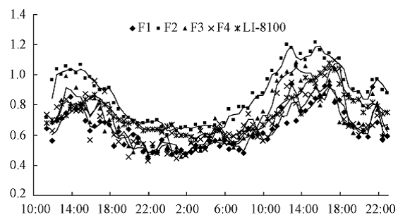 圖b RR-7330測量系統四個通道測量的土壤呼吸與li-8100測量日變化對比(中國林科院,高峻,2011)